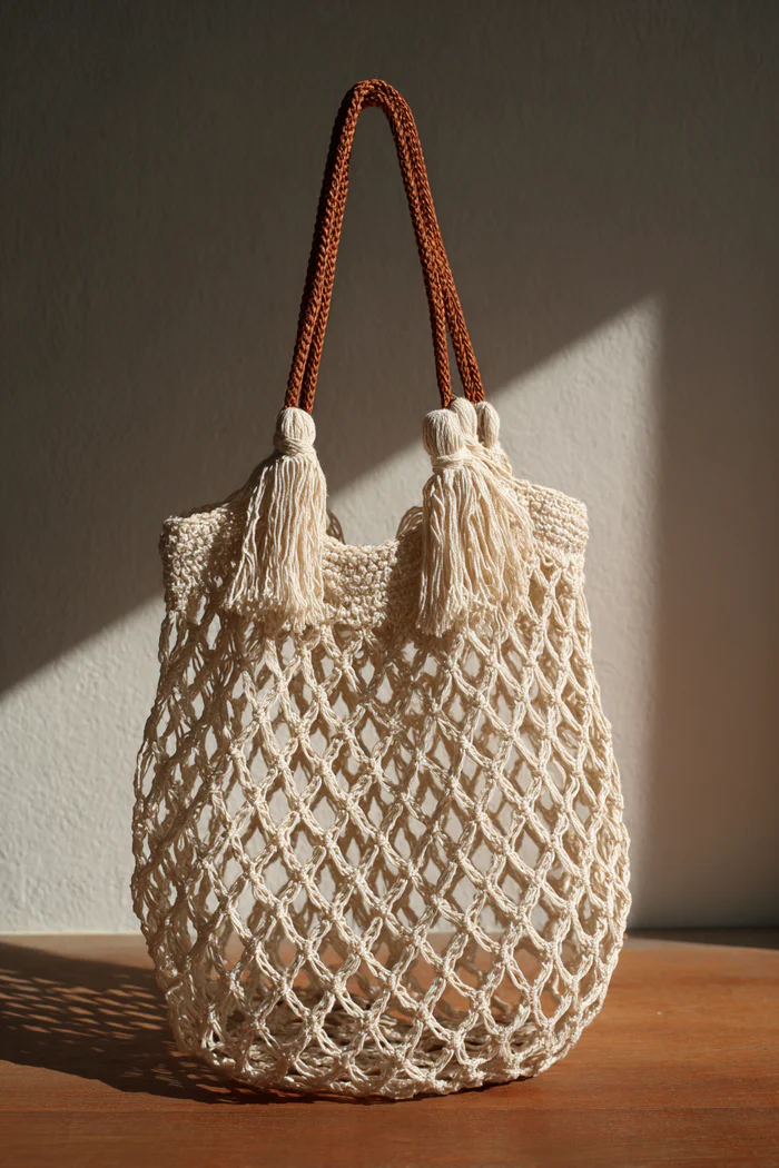 여름에 꼭 필요한 아이템이 있다면 바로 내추럴 네트 백이다. 코튼 끈실이나 린넨사 200~250g으로 가볍게 떠내려간 듯한 망사무늬를 완성하면, 바람까지 드나드는 시원한 무드가 연출된다. 장바구니로도, 해변에서 드는 비치백으로도 손색없고, 화이트 셔츠에 청반지를 매치하면 더할 나위 없이 청량하다.