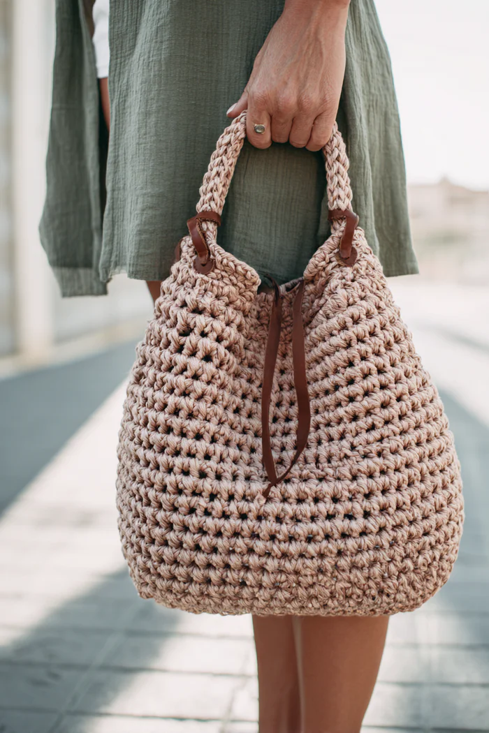 라탄 가방을 사지 않아도 된다. 굵은 면혼방사나 폴리 끈실 350~400g만 있으면 코바늘로도 충분히 구현 가능하다. 짧은뜨기로 바닥부터 단단히 올린 다음 가죽 스트랩을 더하면, 시크하면서도 내추럴한 무드가 완성된다. 와이드 팬츠와 린넨 셔츠에 매치하면 리조트룩 그 자체가 된다.