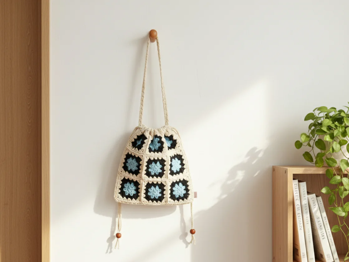 - 손잡이: 끈을 땋거나 사슬뜨기로 길게 만든 다음, 가방 양 끝에 연결해 손잡이를 만들어주세요.