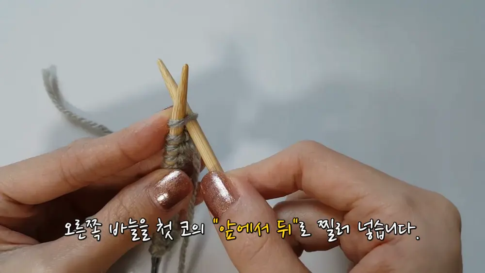 실을 앞으로 가져온 상태에서, 오른쪽 바늘로 감긴 실을 첫 코 사이로 빼낸 뒤