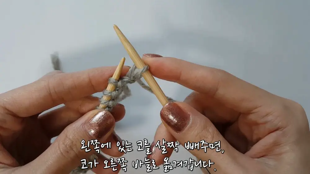 왼쪽에 걸린 코를 밖으로 살짝 빼주면, 코가 오른쪽 바늘로 옮겨갑니다. 이렇게 겉뜨기 1코를 뜬겁니다.