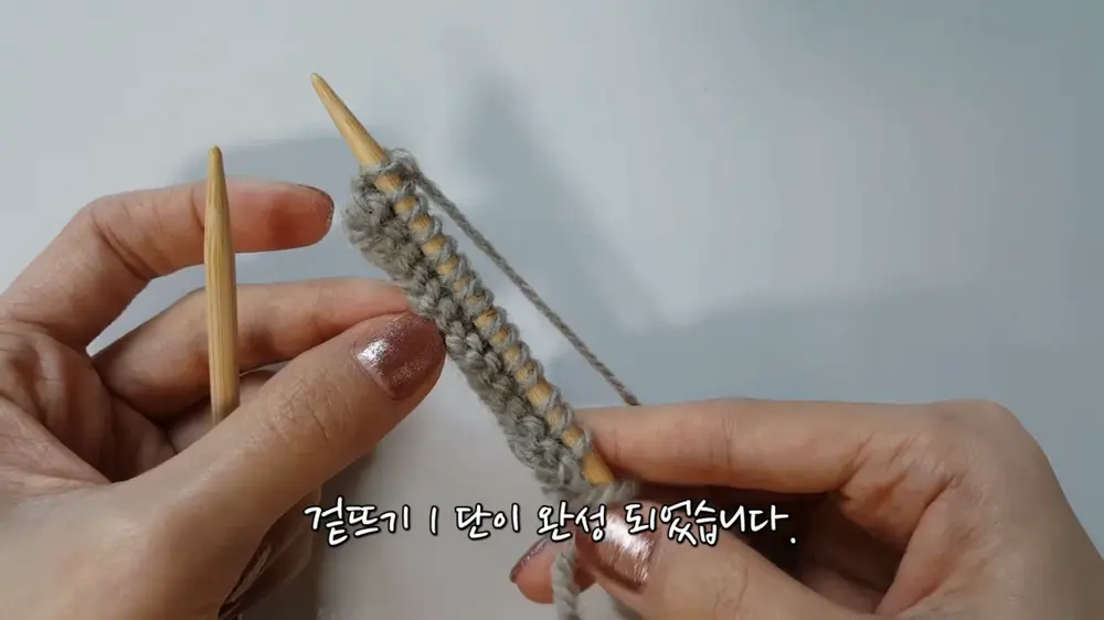편물을 뒤집은 뒤, 겉뜨기를 한 번 더 반복합니다.