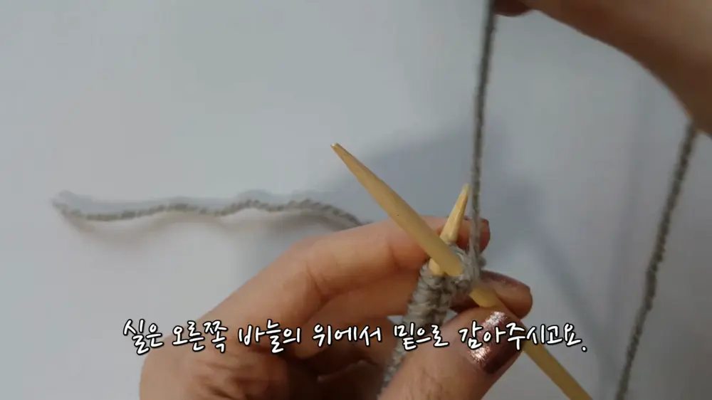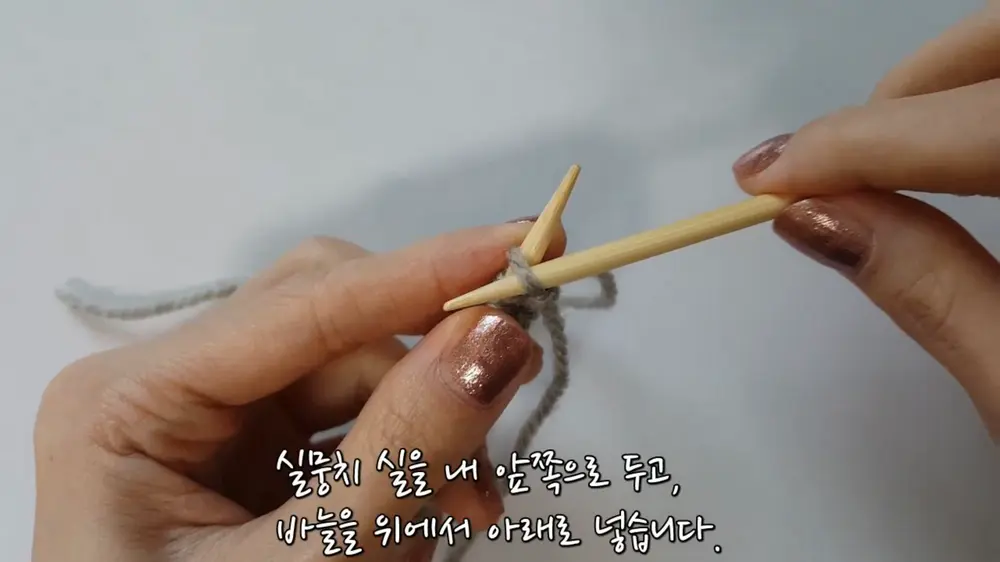 실뭉치쪽 실을 내 앞쪽으로 두세요. 그리고 오른손 바늘을 위에서 아래로 찔러 넣습니다. 겉뜨기는 앞으로 찔러 넣었다면, 안뜨기는 위에서 아래로입니다.
