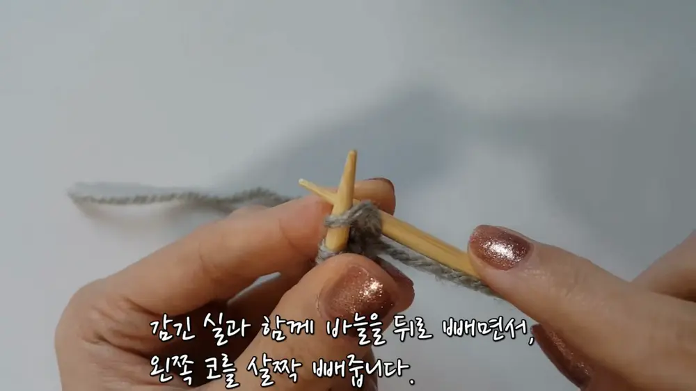그 상태에서 감긴 실과 함께 바늘을 뒤로 빼주면서 왼쪽 코를 살짝 빼줍니다. 그러면 안뜨기 1코가 완성됩니다.