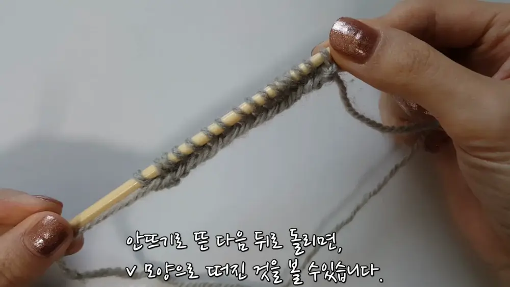 나머지 코를 전부 안뜨기로 떠주세요. 그러면 이렇게 v 모양으로 떠진 것을 볼 수 있습니다.