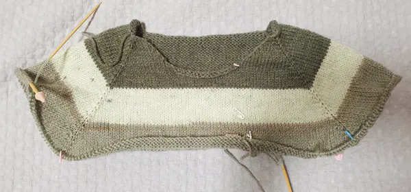 위 사진이 목부터 몸통 고무단까지 뜬 모습입니다. 여기서 분리한 소매를 뜨고, 넥밴드(목 고무단)까지 완성하면 정말 끝입니다.